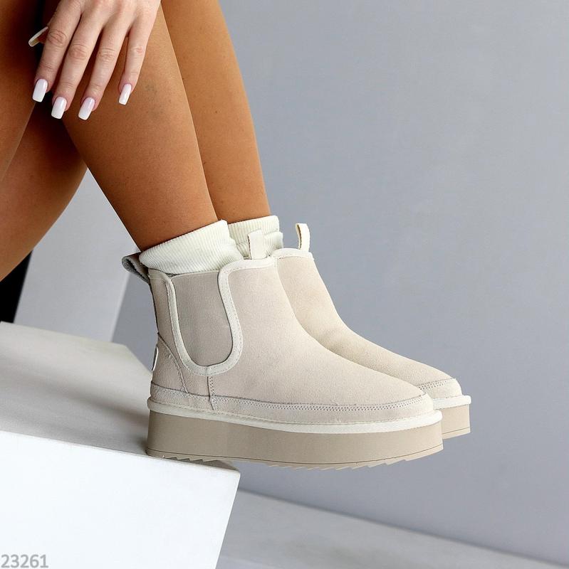 Код 23261 Размеры 36-41 Уггі "Karoline" Материал - НАТУР.ЗАМША / Эластичные вставки Внутри - Экомех Сезон - Зима Цвет - Светлый беж Высота от пятки - 11см Подошва - 4см/3см Производитель - Фабричный Китай На среднюю стопу Размер в размер 36-23,5 37-24 38-24,5 39-25,5 40-26 41-26,5
