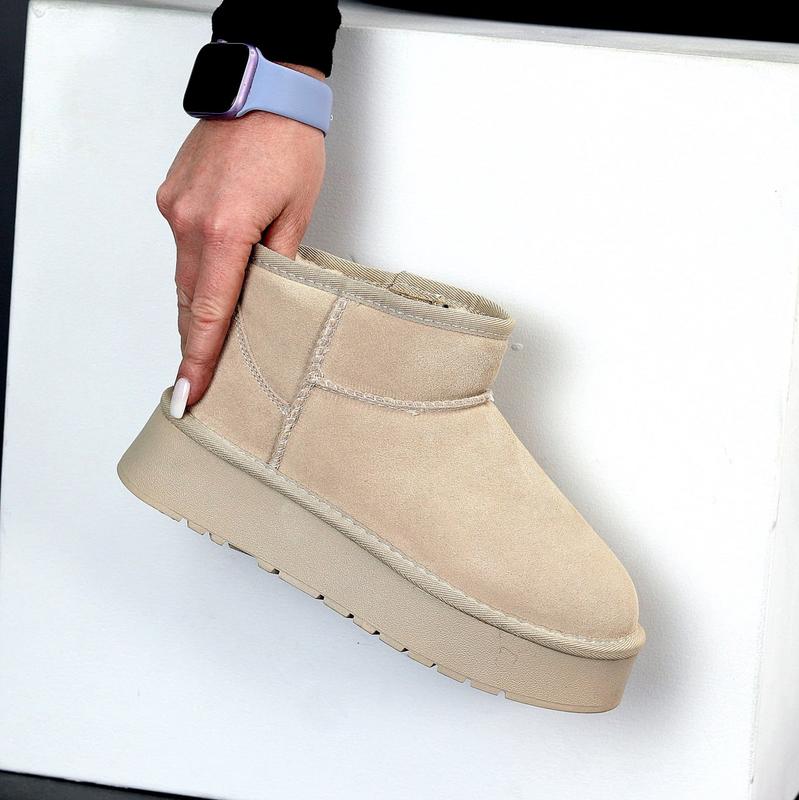 Код 23270 Размеры 37-41 Уггі "Alia" Материал - НАТУР.ЗАМША Внутри - НАТУР.ХУТРО Сезон - Зима Цвет - Беж Высота от пятки - 8,5см Подошва - 4см/3см Производитель - Фабричный Китай На среднюю стопу Размер в размер 36-23,5 37-24 38-24,5 39-25 40-25,5