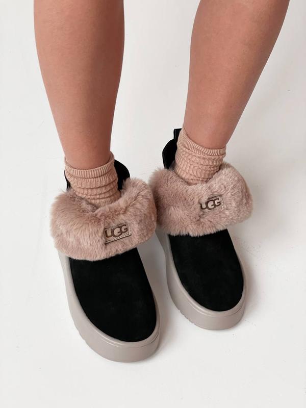 Черные замшевые утепленные ботинки под угги с бежевым натуральным мехом, на очень легкой б...