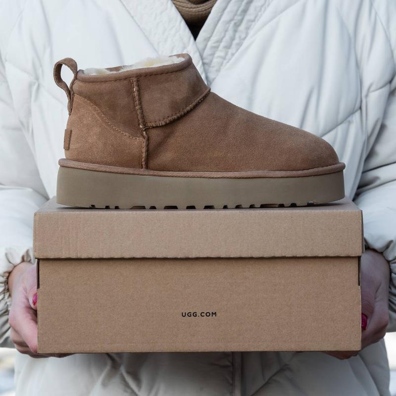 UGG Ultra Mini Mid Platform Chestnut Suede Код : 1626 Производитель : Вьетнам. Материал : Натуральная Замша , замшевая пятка. Подкадка : Натуральный Мех. Подошва : Возвышенная платформа из термостойкой пены. Коробка : UGG , Пергамент , флаер.