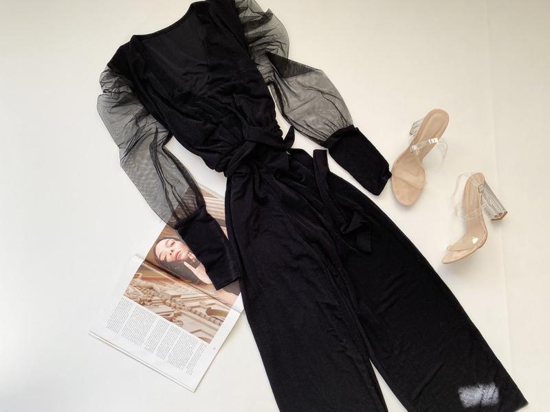 Красивый ромпер комбинезон брючный блестящий рукав сетка 10 м Бирка срезана с размером Длина верха до линии талии 39 см Длина брюк широкие 98 см Плечи 34 Рукав 65 широкий манжет Полуобхват груди 43плюс запах Талии 35 плюс резинка - поясок Стегон 50плюс тканина тягнеться Посадка высокая 35 см Ширина брюк внизу 25 см Состав полиэстер с эластаном