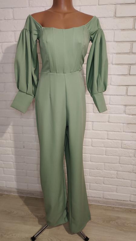 Трендовый комбинезон с корсетным верхом, широкими брюками и объемными рукавами, в идеальном состоянии, размер европейский 10. Замеры: НПО груди 39 см., НПО талии 37 см., НПО бедер 47 см., длина рукава 52 см., длина нижней части от талии 116 см., талия завышена, длина верхней части до талии 35 см., длина общая 151 см.