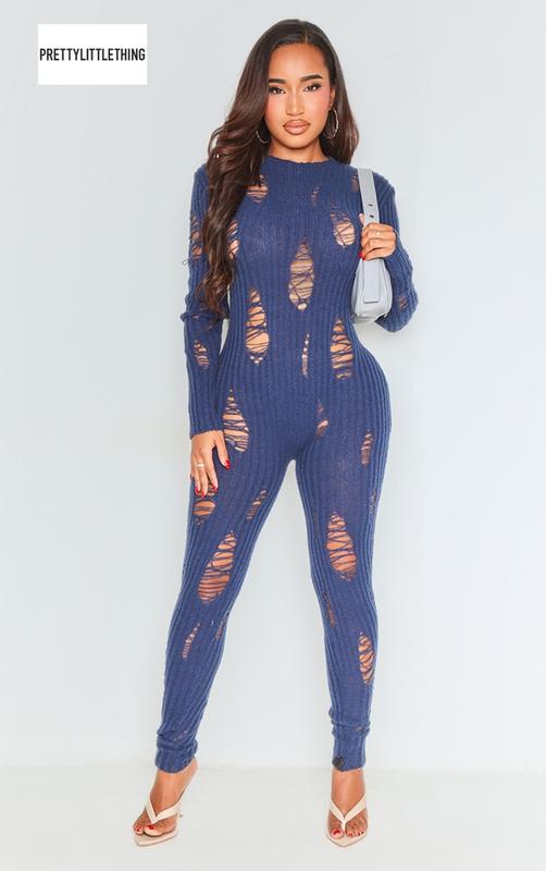 Рваный комбинезон с дырками и длинными рукавами темно-синего цвета prettylittlething