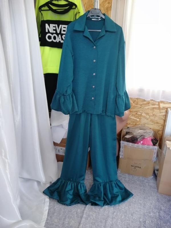 Крутой стильный костюм мокрый шелк вискоза с рюшами воланами высокая посадка размер единст...