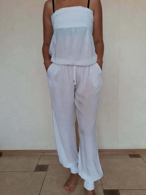 Женский комбинезон белый, новый , размер S - М , из тонкой легкой ткани, эффектный, вверху на широкой резинке без бретелей, внизу манжеты на резинке., есть карманы .На талии тоже резинка и пояс..Производство Греция.Замеры : ПОГ от 27 до 44( растяжение резинки ), ПОБ - 58 см, длина изделия от верха.резинки до талии 41 см, длина от талии вниз 94 см с манжетой.