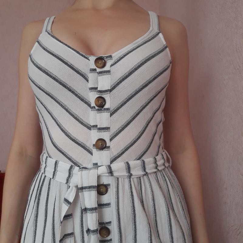 Лёгкий комбинезон белого цвета в темно- синюю полоску.На бретелях.Застегивается на 5 пуговиц+ завязывается на пояс.Состав:100% коттон.Замеры:ПОГ 49 см,ПОТ 39 см,ПОБ 56 см.Длина 124 см,длина штанин 80 см.