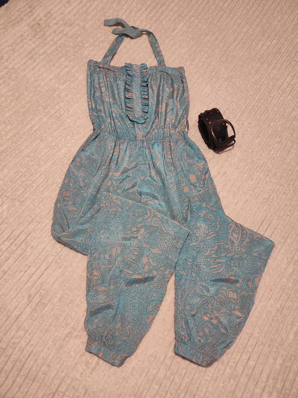 Шикарный шёлковый комбинезон в красивый принт в размере xs-s, может небольшая m( бедра позволяют). Воздушный, лёгкий, невесомый, в меру кокетлив. Верх топом, открытые плечи, завязывается на шее при желании. По груди и снизу на брючках присобран на резинку. В талии тоже мягкая, имеются шлёвки, очень здорово выглядит с ремнем, 2 кармана. Длина 135 см, шаговый 82 см на высокую девушку, но в силу того, что брюки внизу на резинке, можно носить как палаццо, что сейчас в тренде( струящаяся ткань опускается), как делала я на 165, не отрезая. Комбез, как новый, текстуру ткани постаралась передать, переливается на солнце. Без торга пожалуйста. Все необходимые замеры прилагаю, по всем оставшимся вопросам буду рада ответить. Качественных и стильных Вам покупок!