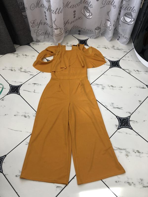 Брючный комбинезон кюлотами насыщенного горчичного цвета от Boohoo размер 8/S. Ткать стрейчевая тянется. В отличном состояниии, но есть маленький дефект смотри последнее фото маленький разрез его не видно он сверху перекрывается, можно прострочить машинкой. Замеры изделия: ПОГ 36-37 см, ПОТ тянется до 40 см, длина изделия 118 см