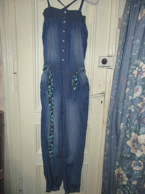 комбинизон джинсовый.синего цвета.хлопок.джинс тонкий.ПОГ 487ПОТ 36.ПОБ 46.длина 148.длина по внутреннему шву 73