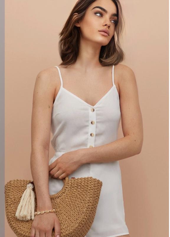 Повітряної структурної тканини. Вузькі бретелі та трикутний виріз із застібкою спереду. Розріз на спині з перекрученою деталлю зверху та гумкою ззаду на талії. Потайна блискавка збоку. Низ на трикотажній підкладці. Збоку на блискавці. Позаду талія гумка. Розмір: 36:
