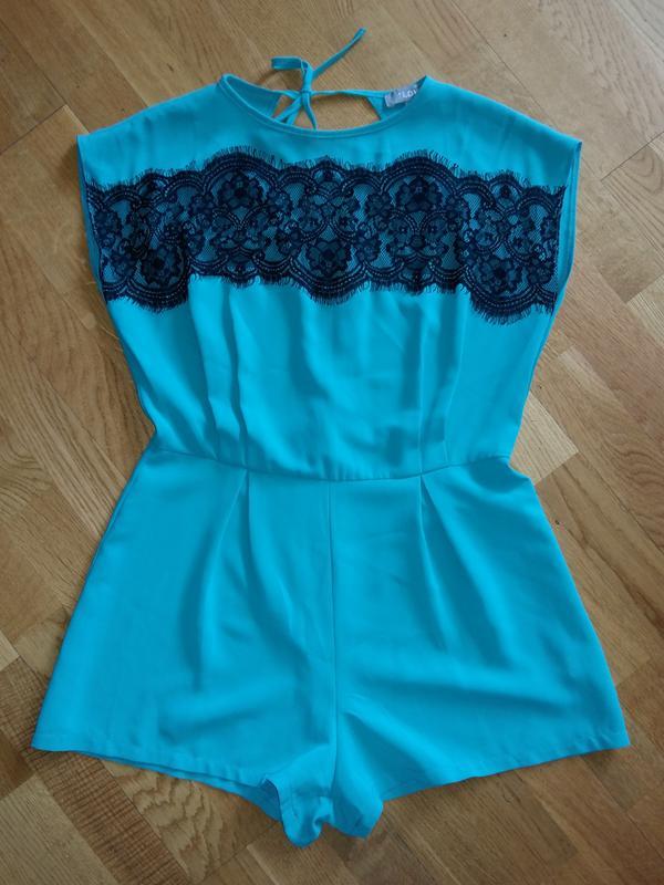 Нарядный стильный комбинезон невероятно красивого бирюзового цвета. По талии отрезной и немного как бы с напуском, на груди нашито красивое кружево. Рукава нет, но плечики спущенные, так что само плечо прикрыто. Не менее интересен сзади: застегивается на молнию, а сверху завязки, образуется красивый вырез на спине. Замеры: плечи- 51, талия- 37, ПОГ- 48, длина от плечевого шва- 72.длина от верха до талии- 41. длина шортиков по боковому шву- 32