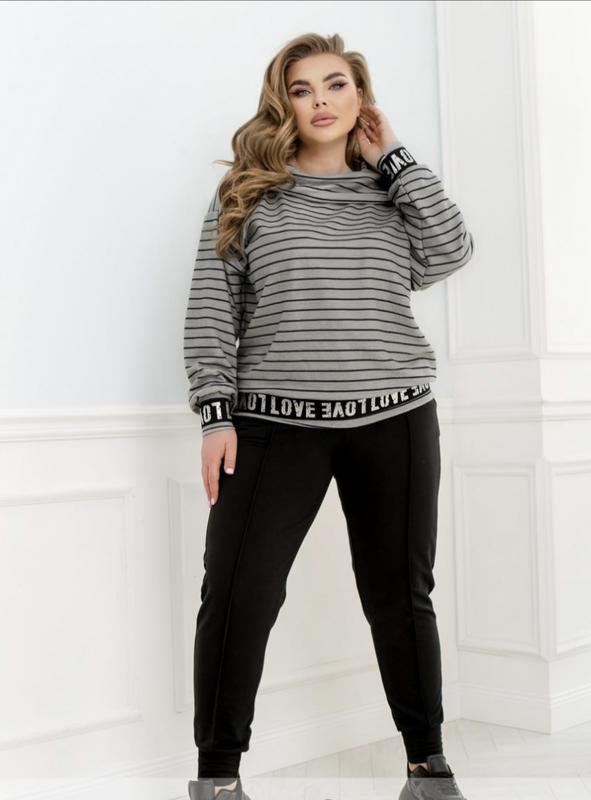 МАТЕРІАЛ: Трикотаж петля РОЗТЯЖНІСТЬ: Середня розтяжність (2-4см) КОЛІР: сірий , джинс , бежевий, молочний Зручний та комфортний костюм в повсякденному стилі. М'який светр в актуальний принт в полоску з широкою горловиною. Рукава приспущеного крою з декоративним манжетом-резинкою. Стильно виглядає в повсякденних образах та легко поєднується з будь-яким низом. Завдяки цікавому акценту у вигляді гумки на рукавах та подолі виглядає більш стильно та сучасно. Штани з нашитою "стрілкою" спереду по центру. До манжетів внизу вшито гумку з боків - кишені у шві. Орієнтовні заміри готового виробу: Кофта: ✅50-52 р-р: довжина виробу: 68см, обхват рукава 42см, довжина рукава від плечового шва 48см, ОГ - 116см, ОТ - 112см, OC - 102см. ✅54-56 р-р: довжина виробу: 79см, обхват рукава 45см, довжина рукава від плечового шва 49см, ОГ - 122см, ОТ - 118см, OC - 110см. ✅58-60 р-р: довжина виробу: 72см, обхват рукава 48см, довжина рукава від плечового шва 50см, ОГ - 128см, ОТ - 124см, OC - 118см. ✅62-64 р-р: довжина виробу: 74см, обхват рукава 51см, довжина рукава від плечового шва 52см, ОГ - 134см, ОТ - 130см, OC - 124см. Брюки: ✅50-52 р-р: довжина брюк по внутрішньому шву 75см, довжина брюк по зовнішньому шву з урахуванням пояса 105см, ОТ - 85см, OC -112см. ✅54-56 р-р: довжина брюк по внутрішньому шву 75см, довжина брюк по зовнішньому шву з урахуванням пояса 106см, ОТ - 88см, OC -118см. ✅58-60 р-р: довжина брюк по внутрішньому шву 75см, довжина брюк по зовнішньому шву з урахуванням пояса 107см, ОТ - 90см, OC -130см. ✅62-64 р-р: довжина брюк по внутрішньому шву 75см, довжина брюк по зовнішньому шву з урахуванням пояса 108см, ОТ - 95см, OC -130см. РЕКОМЕНДАЦІЇ ПО ДОГЛЯДУ: делікатне прання ☑️Залежно від в кольоропередачі Вашого монітору, відтінок виробу може дещо відрізнятися. 🔹Оплата на картку ПриватБанку, Монобанку 🔹Нова пошта, Укрпошта 🔹Обмін та повернення З радістю відповім на ваші питання, допоможу підібрати розмір🌷 224
