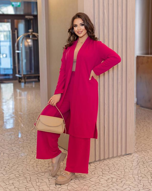 Костюм двойка Размеры: 48-50, 52-54, 56-58 Ткань: структурный трикотаж Стильный удобный костюм двойка для элегантных женщин. На кардигане небольшие разрезы по бокам. Брюки на резинке. Тканина добре тягнеться, практично не мнеться, не кошлатиться. Цвета: черный, синий, зеленый, фуксия Мод 853 кардиган+брюки Кардиган 48-50 длина 109 см, длина рукава 62 см, ОГ 104,ОТ104,ОС104 см 52-54 длина 109 см, длина рукава 62см,ОГ 112см,ОТ112см,ОС112 56-58 длина 109см, длина рукава62см, ОГ120см, ОТ120см, ОБ120 см Штани 48-50 длина 105см,ОТ64-106 см, ОБ102см 52-54 длина 105см,ОТ68-110см,ОС116см 56-58 длина 105см,ОТ 72-114см, ОБ 120см