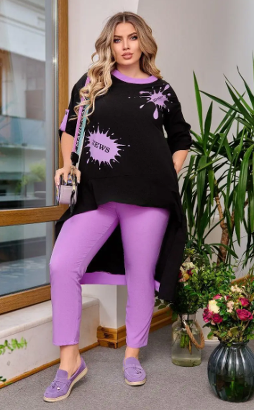 Ткань: Софт высокого качества + аппликация из ткани – не трескается. Размеры 56-58. Фактические Замеры: По 48-50 размерам. Туника: Длина спереди – 74 см. Длина по спинке – 110 см. ОГ – 116 см. Руково-30 см. ОТ – 128см. На подоле – 134 см. Брюки: Длина по наружному шву – 93 см. Длина по внутреннему шву – 67 см. Обхват бедер – 112 см. К каждому последующему размеру прибавления + 4 см (на единичные размеры). На спаренные +8 см, кроме длины изделия