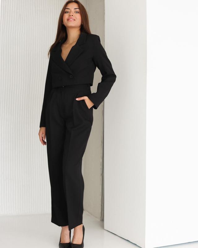 Стильный костюм с коротким пиджаком и брюками палаццо