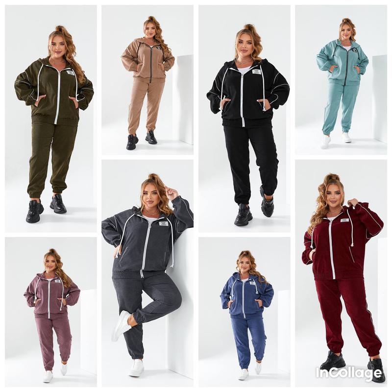 Прогулочный костюм Код: 330 Размеры: 48-50, 52-54, 56-58 Тканина: вельвет Цвета: черный, бордо, мокко, графит, мята, джинс, хаки, фрез Кофта на молнии декорирована хб кантом, глубокий, удобный капюшон, нашивка Параметри кофти: 48-50: ог - 128 см, длина кофты - 70 см, длина рукава от горловины - 75 см 52-54: ог - 136 см, длина кофты - 71 см, длина рукава от горловины - 77 см 56-58: ог - 144 см, длина кофты - 71 см, длина рукава от горловины - 78 см Брюки свободного кроя с высокой посадкой, пояс резинка, карманы, внизу манжет (резинка) Параметры брюк: 48-50: ос - 112 см, длина по внутреннему/внешний шву - 71/101 см 52-54: ос - 120 см, длина по внутреннему/внешний шву - 71/101 см 56-58: ос - 128 см, длина по внутреннему/внешний шву - 72/102 см