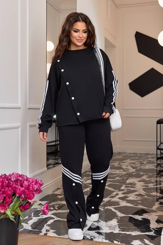 Костюм Модель 914VL Ціна : 980 грн Розміри: 46-48,50-52,54-56,58-60 Тканина : двонитка ( гарної якості) Костюм -двійка з робочими , білими , пластиковими кнопками, пришивні білі лампаси. Вільна кофта , приспущений рукав на манжеті, без накату на грудях ; штани на широкій резинці , з боків кишені , нижче колін трішки вільні