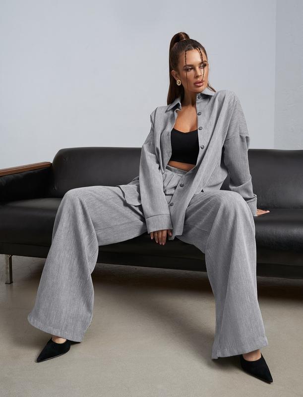 Арт.14474 Текстурированный льняной костюм в стиле пижамы. Рубашка на пуговицах с асимметричным удлиненным кроем, длинными рукавами и воротником. Широкие свободные брюки с высокой посадкой и эластичной резинкой на талии.