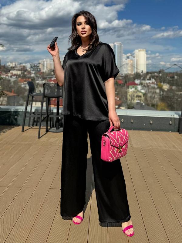 Костюм шелковый в пижамном стиле блуза футболка туника брюки штаны широкие палаццо батал ч...