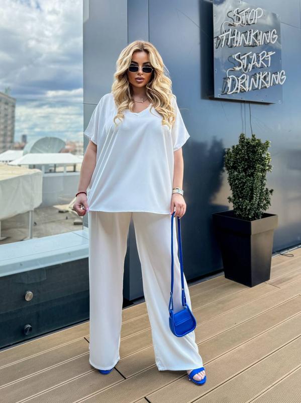 Костюм шелковый в пижамном стиле блуза футболка туника брюки штаны широкие палаццо батал ч...