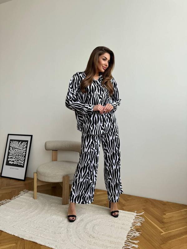 Костюм 😍 Модель 157 ▫️Тканина: софт принт ▫️Колір: чорний, білий ▫️Розмір: 42, 44, 46, 48 Ціна: 640 грн ‼️ ЗАМІРИ: ✔️Розмір : 42 Сорочка Довжина : 65 см Напівобхват грудей : 54 см Довжина рукава : 58 см Плече : 14 см Брюки Довжина : 101 см Напівобхват стегон : 54 см Напівобхват пояса : 30 см ( на резинці) ✔️Розмір : 44 Сорочка Довжина : 65 см Напівобхват грудей : 57 см Довжина рукава : 58 см Плече : 14 см Брюки Довжина : 101 см Напівобхват стегон : 57 см Напівобхват пояса : 33 см ( на резинці) ✔️Розмір : 46 Сорочка Довжина : 66 см Напівобхват грудей : 59 см Довжина рукава : 59 см Плече : 14 см Брюки Довжина : 101 см Напівобхват стегон : 59 см Напівобхват пояса : 36 см ( на резинці) ✔️Розмір : 48 Сорочка Довжина : 66 см Напівобхват грудей : 62 см Довжина рукава : 59 см Плече : 14 см Брюки Довжина : 101 см Напівобхват стегон : 62 см Напівобхват пояса : 38 см ( на резинці) Ця модель відправляється тільки по повній передоплаті на карту або накладеним платежем по частковій передоплаті. Уточнюйте наявність потрібного розміру та кольору перед оформленням замовлення 🌹