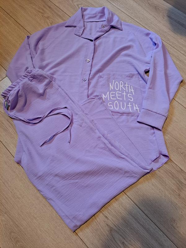 Блузка: длина-72,рукав-64, пог-58 Штани: длина-94,пояс-36(тянется до 46), поб-50,ширина штанины-32,длин.по внутреннему шву-65 Размер:L/46-48 Цвет:сиреневый 95%-поліестер,5%-еластан