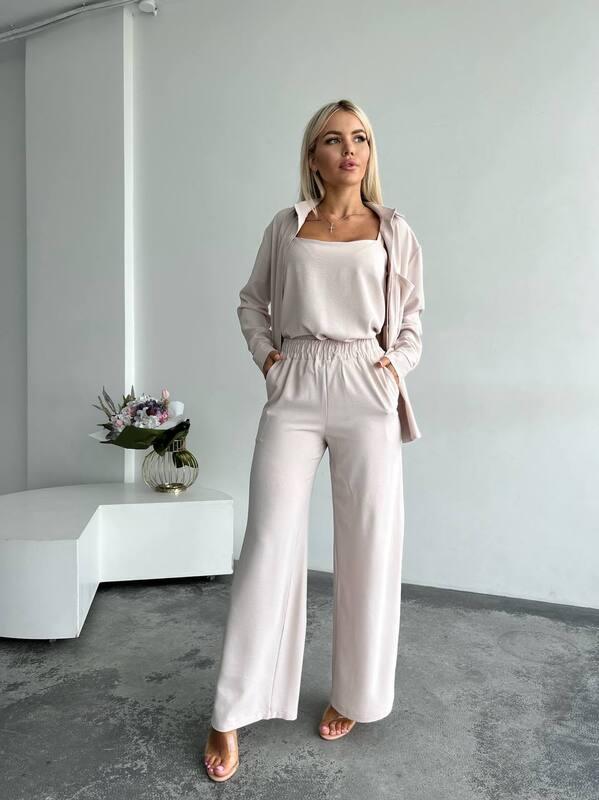 Трендовый брючный костюм-тройка жатка / майка рубашка и брюки
