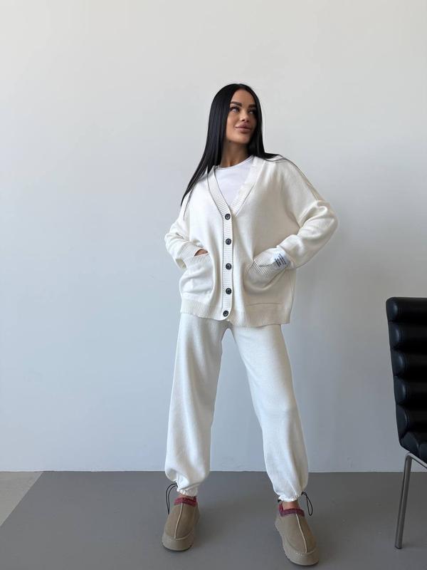 Стильные вязаные костюмы оверсайз Высокое качество, Турция 🇹🇷 Размер универсал Молочный, светло-серый и темно-серый Кардиган Ширина 65 см Длина 64 см Рукав от плеча 75 см Штани Длина 101 см Талия 64-90 см Стегна 100-120 см Еж