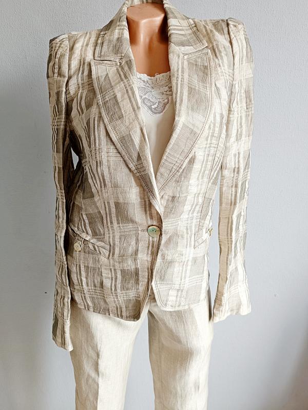 Костюм із змішаної лляної тканини, легка текстура, штани 7/8 (трохи укорочені), жакет на гудзику з підплічниками, без підкладки, дуже легкий, із фактурної тканини, розмір европейський 36, стан нової речі, виміри: жакет: довжина - 60 см, плечі - 35-36 см, ПОГ - 47-49 см, довжина рукава - 64 см. штани: довжина - 93 см, довжина по внутрішньому (паховому шву) - 68 см, ПОТ - 38 см, ПОС - 51 см, ширина штаніни - 26/20/16. ПОВЕРНЕННЯ та ОБМІНУ ТОВАРУ НЕМАЄ! Підписуйтесь та дивіться інші мої товари, так Ви зможете знайти цікаві ексклюзивні речі. Буду щиро рада співпраці з Вами.🙂