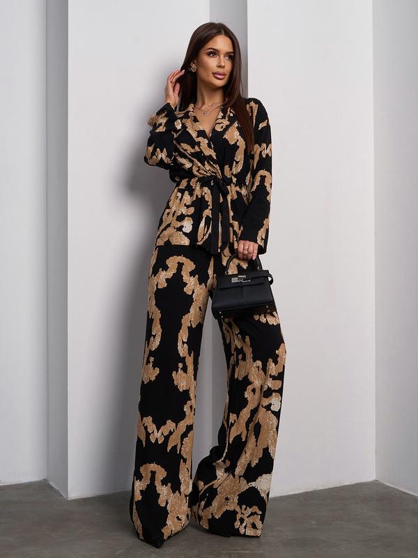 Черный брючный костюм-кимоно из принтованного хлопка, issa plus