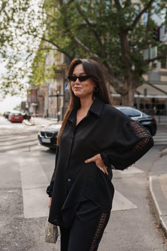 Брючный костюм двойка Арт 5963 Цвета: белый/черный Материал: американский креп жатка. Практичная, слабо мнется, хорошо пропускает воздух Брюки и рукава украшены кружевом. Длина брюк 79/110. Пояс на резинке, высокая посадка. Длина блузы по переду -78 см. Застежки - пуговицы. По бокам разрезы. Можно носить в оверсайзном стиле или связать впереди. Замеры по изделию: 🔹1 р 42-46: ОГ 100, ОС 110 🔹2 р 48-56: ОГ и ОБ 120 см 🔹3 р 58-62: ОГ и ОБ 135 см 🔹4 р 64-70: ОГ и ОС 150 см