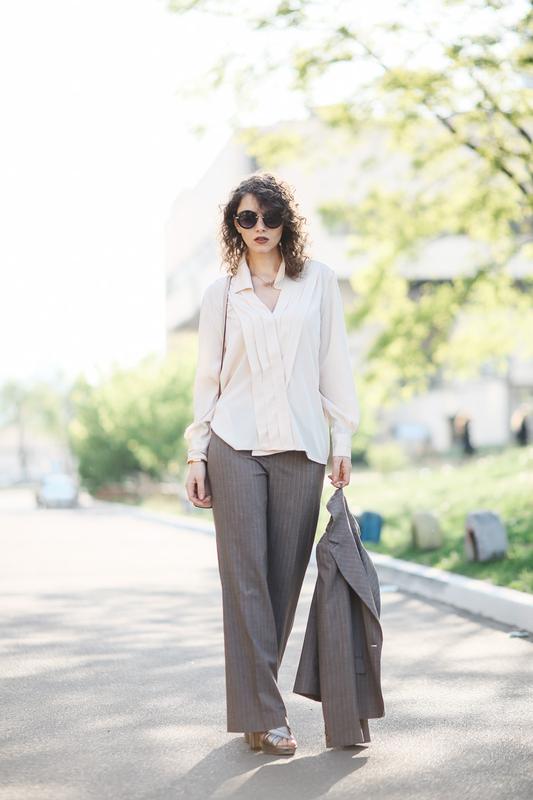 Шикарный брючный костюм, который можно носить по отдельности! Коричневого оттенка, тонкая полоска. Жакет от плеча до плеча 40, рукав 62. Брюки: высокая талия и широкий пояс, ПОТ - 48, ПОБ 55. Размер UK10, сидит свободно, комфортно.