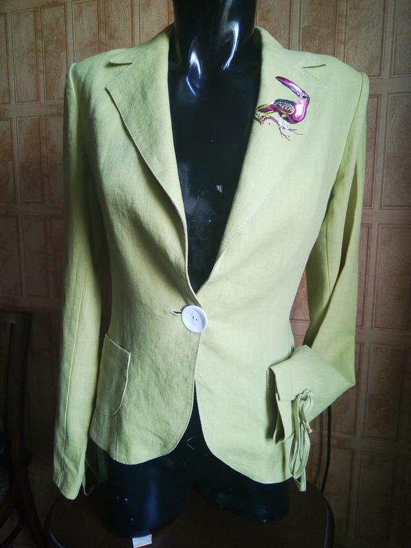 Супер орригинальный брючный костюм. Пиджак приталеный салатового цвета застегивается на одну пуговицу. На лацкане пиджака вышивка в виде экзотической птицы украшена стразами. Есть карманчики. Пиджак можно комбинировать с другими вещами. Брюки - белый лен прямого кроя. Широкие от бедра. Внизу на штанинах вышивка в виде стеблей растений с мелкими цветами, очень не наляписто. Пояс ровный, застежка на молнию и пуговица. Белые брюки универсально сочетаются с любым верхом. Этот костюм значительно разнообразит Ваш гардероб. Замеры пиджака: Ширина по плечам спинка 40 ПОГ 42, ПОТ 37 Длинна от шеи по спинке 60 длинна рукава от плеча 62 Замеры брюки Посадка средняя ПОТ 40 ПОБ 48 Высота от верха пояса до внутр.шва спереди 26 Длинна по наружному шву 105 Ширина штанины верх 30 Ширина штанины низ 30 Будут вопросы- пишите. С удовольствием отвечу. Торг