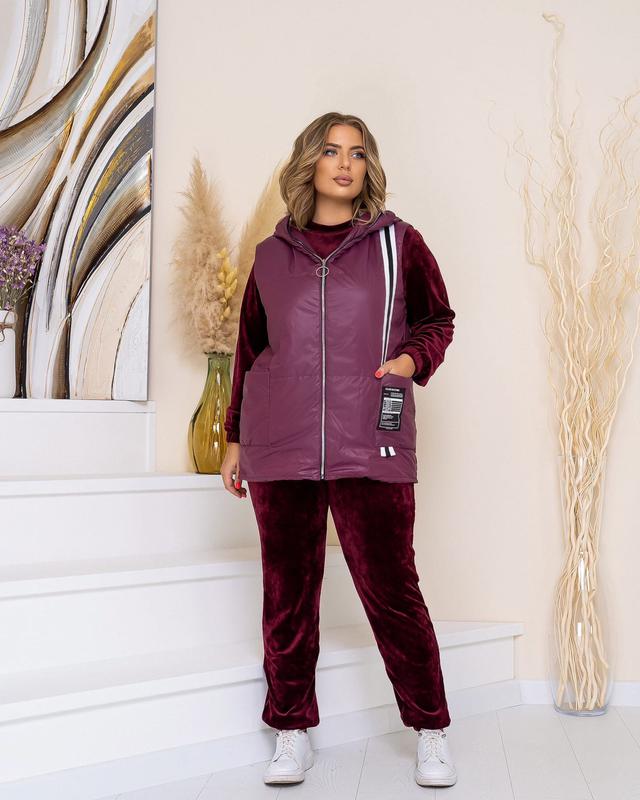 Костюм (3-ка) 5054 Размеры: 1(48-50),2(52-54),3(56-58) Ткань: жилет-плащевка lake стёганная на синтепон 100, подклад полиестр Костюм- ткань велюр (Турция) Цвета: чёрный/бежевый, марсал/марсал, цвет пепельной розы/лиловый, синий/индиго, капучино/темный моко Цена 1100 гр Замеры по ткани Свитшот: 1(48-50)-ОГ(114),ОБ(116) 2(52-54)-ОГ(120),ОБ(122) 3(56-58)-ОГ(130),ОБ(132) Длина рукава 62см Длина изделия по спинке 65см Брюки: Пояс брюк на резинке Посадка брюк высокая,очень удобная 1(48-50)-ОБ(112) 2(52-54)-ОБ(118) 3(56-58)-ОБ(126) Длина по внешнему шву 110см Длина по внутреннему шву 82см Жилет: 1(48-50)-ОГ(118),ОБ(120) 2(52-54)-ОГ(124),ОБ(126) 3(56-58)-ОГ(132),ОБ(134) Длина изделия по спинке 76см