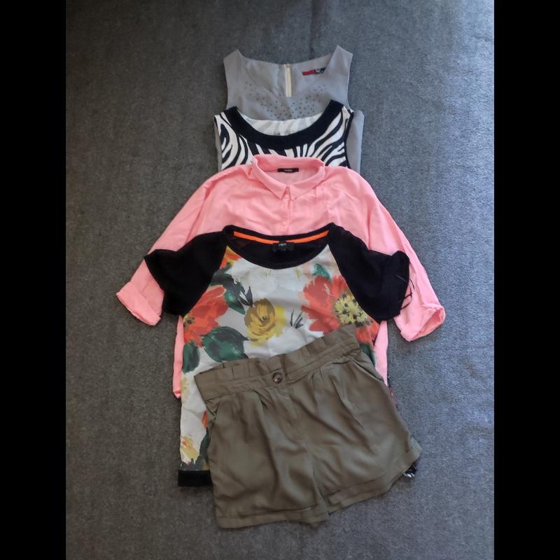 Лот женских вещей из 5шт: Сукня футляр Платье в тропический принт Вискозная блуза розового цвета Футболка, спереду шифонова Шорты цвета хаки Смотрите другие мои объявления э много интересного, делайте подписи.