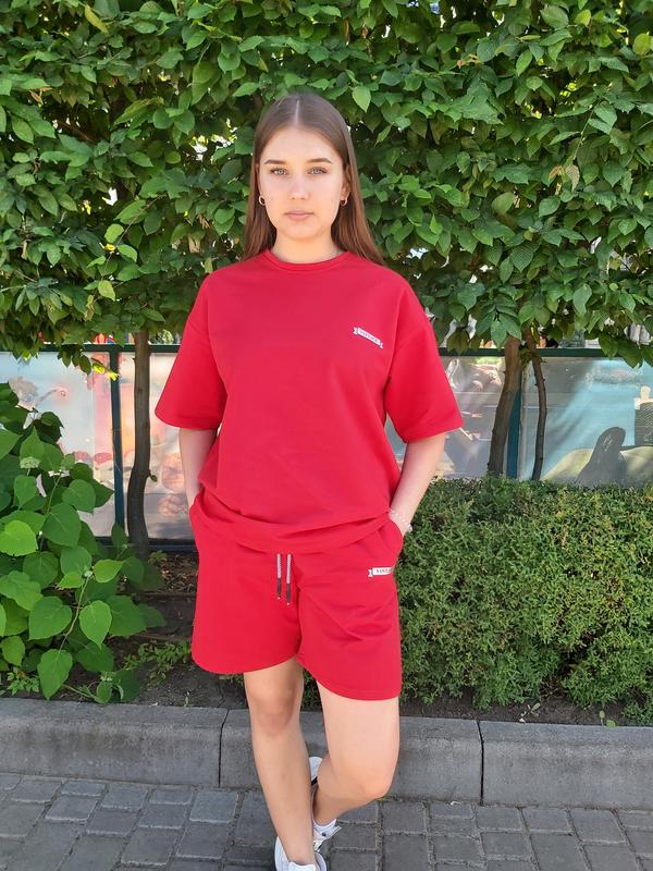 Летний женский костюм с шортами, хитовая новинка этого года, красиво смотрится, ткань трикотаж турецкая двухнитка хорошего качества не кашлатится, цвет красный, шорты с карманами, пояс на широкой резинке. Размеры S, M, L, подходит и на XL. ЗАМЕРЫ ФУТБОЛКА Длина футболки по среднему шву спинки от горловины/Полуобхват груди S/67/55 M/71/57 L/75/60 ШОРТЫ Длина шорт побоковомушву/ Полуобхват бёдер/Полуобхват талии S/40/54/34 M/43/56/35 L/45/58/37 +/- 1 , см погрешность в измерении.