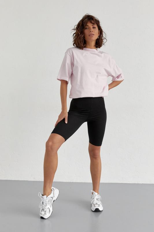 Этот модный женский костюм с шортами подойдет и для летних прогулок, и для занятий спортом, и для отдыха дома. В комплекте черные шорты из трикотажа выполнены в стиле "велосипедок", а цветная футболка - в стиле oversize. В шортах края низа прямые, вверху вшита узкая резинка. В футболке с короткими рукавами низ прямой, проймы опущенные, а горловина дополнена окантовкой. Интересным дополнением для костюма – плечевая портупея, которая придает образу экстравагантности.