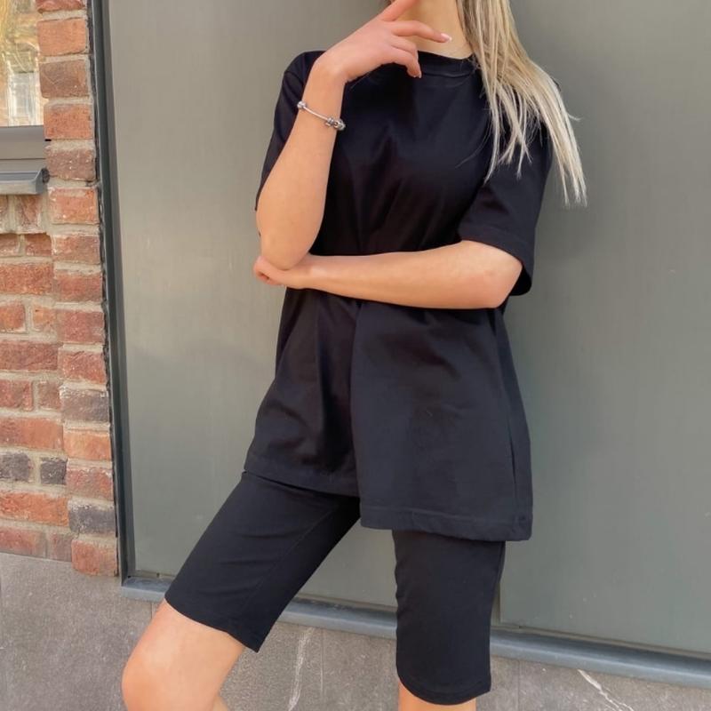#Костюм Размеры: 42-46, 48-52 Артикул: 505\322 Материал: кулир( трикотажная ткань из хлопка, тянется, не кашлатится) Цвет: белый+ чёрный, беж+чёрный, чёрный+ чёрный Фото реал Замеры: 42-46 ОГ 104см/ ОТ 70 см/ ОБ 92 см 48-52 ОГ 114 см/ ОТ 78 см/ ОБ 104 см Длина футболки 73 см/ рукав 24 см Длина велосипедки 52 см