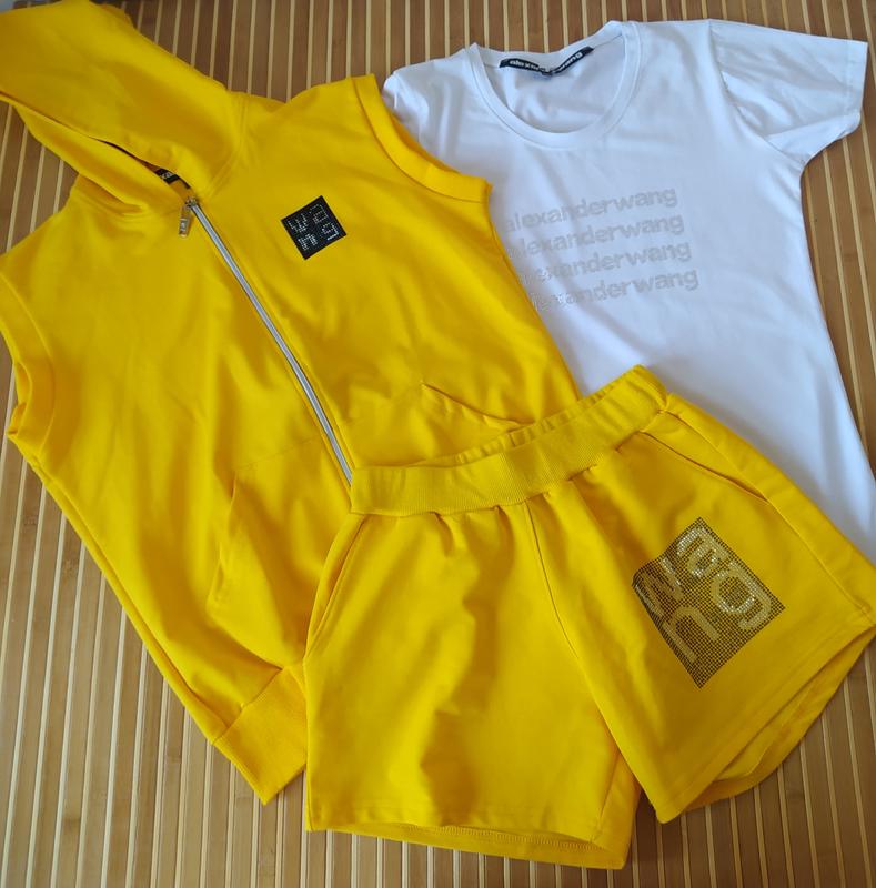 Распродажа! Летний женский жёлтый костюм тройка Alexander Wang 3 вещи - футболка, шорты, жилет Ткань - трикотаж, тянется. Размер указан XL , но реально маломерит! Подойдёт на S - L Футболка от подмышки до подмышки 45 см, длинна по спинке 60 см Жилет от подмышки до подмышки 50 см Качество супер! Производство Турция.