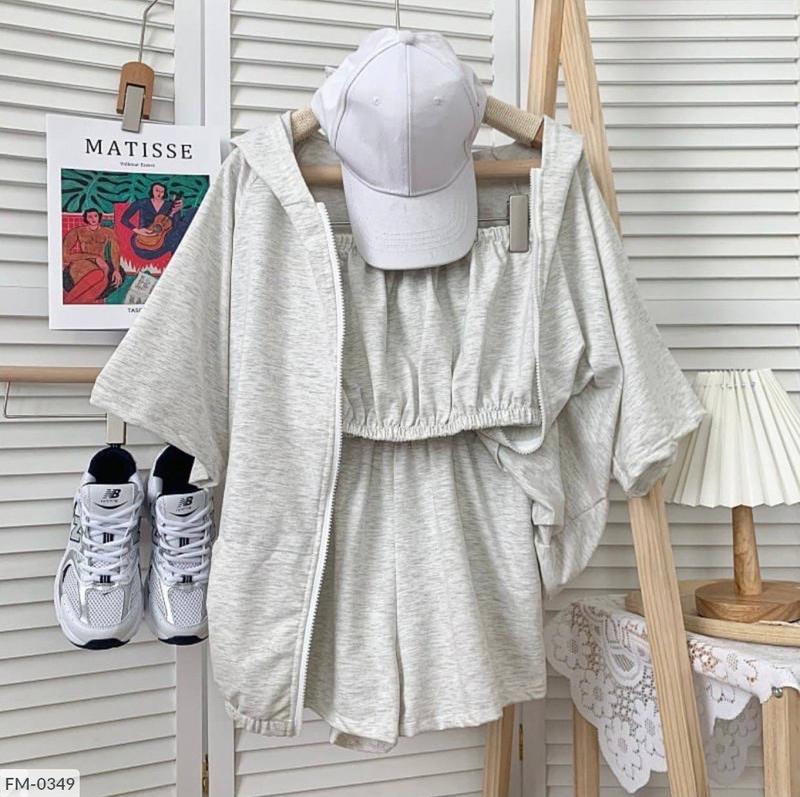 Костюм FM-0350 Размеры: 42-44, 44-46 Костюм тройка (худи+топ+шорты) Ткань: двухнитка Цвет: чёрный, серый, горчица, персик Длина шорт 40см, высокая посадка