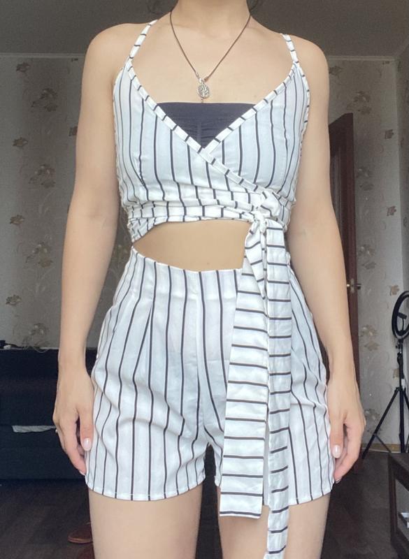 Летний костюм, лёгкий материал, красивая спинка у топа, завязывать веревочки можно как угодно, спереди и сзади
