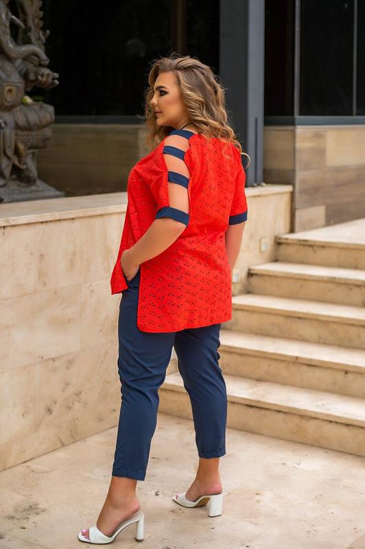 Розміри: 48-50,52-54,56-58 Костюм 2 ка Тканина: софт, прошва Заміри блузу: 1(48-50)- ОГ(104), ОБ(108) 2(52-54)- ОГ(110), ОБ(118) 3(56-58)- ОГ(116), ОБ(128) Довжина виробу по спинці 74см Довжина рукава 40см Штани пояс на резинці: 1(48-50) – ОБ(110) 2(52-54) - ОБ(118) 3(56-58) - ОБ(126) Довжина зовнішній шов 106см Довжина внутрішній шов 79см код 01072220