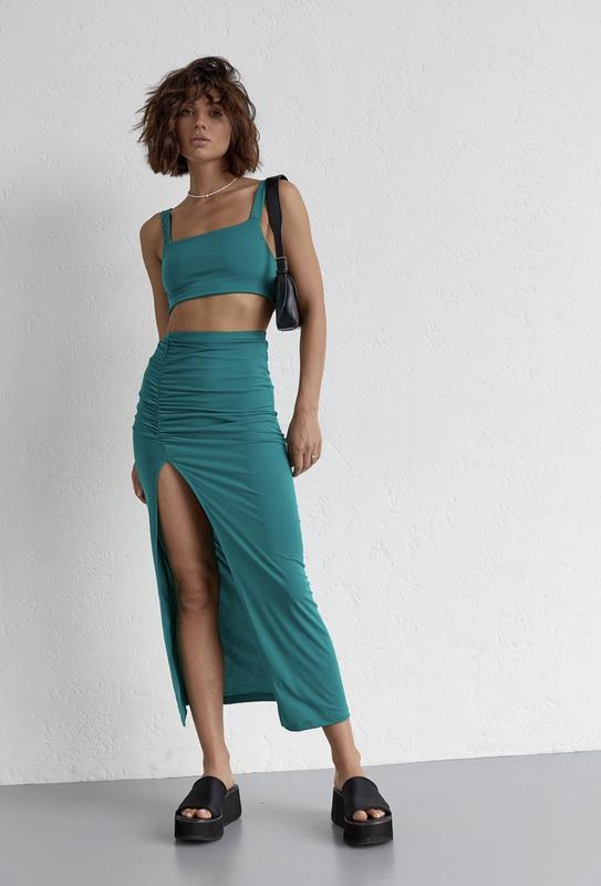 Эффектный и стильный костюм, который состоит из топа и юбки, не оставит вас без взгляда окружающих👀 •Короткий топ с широкими бретелями, в середине которых вшита широкая резинка(без замка). • Юбка миди, которая имеет резинку в поясе, а спереди, с правой стороны, имеет дополнительный шов, который сверху припосаден в складки за счет резинки, а внизу заканчивается высоким разрезом. •Освежите ваш образ и добавится легкости. Можно комбинировать в других стилях и с разными образами. •Состав:полиэстер-95%, лайкра-5%. Материал:бифлекс. •Размер: Зеленый -М Синий. -L Параметры модели:84/60/92, рост-173см. Производитель: Турция •Замеры в каруселе. По желанию скина видео на модели 💕