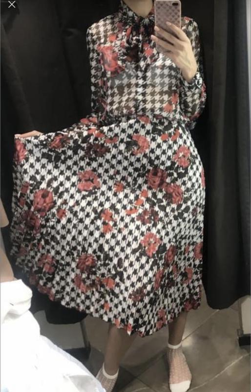 Костюм юбка плиссе плиссировка миди блузка гусиная лапка в виде шаннеля пионы розы