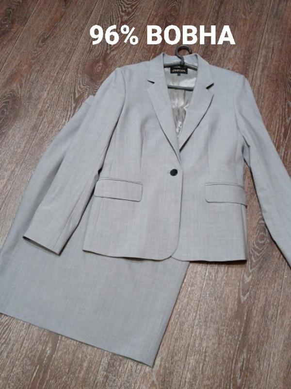 Стильный, качественный, шерстяной, деловой костюм от известного английского бренда JAEGER. Отличный состав: 96% шерсть, 4% эластан. Материал тонкий и приятный на ощупь. Подкладка 100% вискоза. На бирочках размер 12. Замеры делали с верха. Пиджак: Полуобхват груди 50 см, по талии 44 см, по низу 56 см. Ширина в плечах позаду 42 см. Рукав длина от плеча 62 см. Высота по спине от плеча у горловины 64 см, от подмышек 41 см, по переду по середине 34 см. Юбка: Напівобхват по поясу 40 см , по стегнам 52 см , по низу 47 см. Высота по боковому шву 67 см, включая пояс 3 см. Застегивается на молнию сзади. Камера не совсем верна передает цвет, ближе всего 9 фото. ❗Отправляем после полной платы на карточку Приватбанка. ❗Доставка Новой или Укр по почте за средства покупателя. ❗Возвращение и обмен нет. *5309*