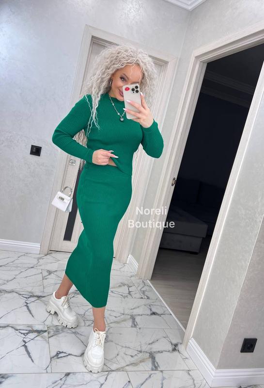 Яркий практичный вязаный базовый зеленый костюм двойка с юбкой миди с кофтой