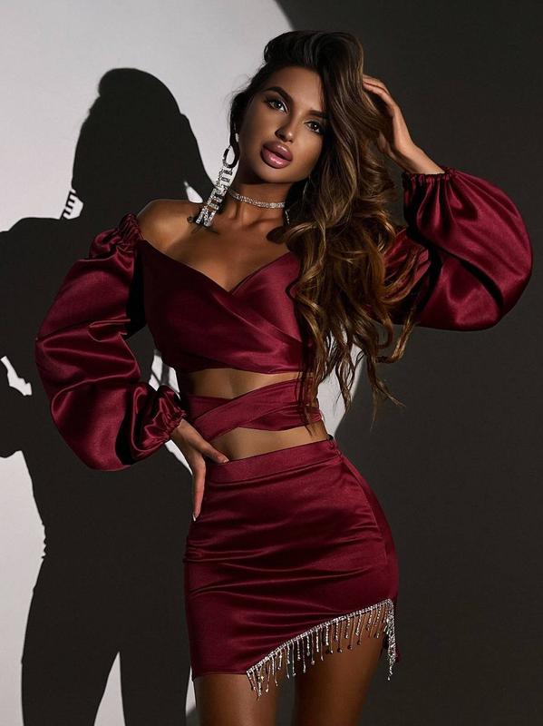 Атласний комплект, бахромою зі стразами ручна робота, прикраса пришита
