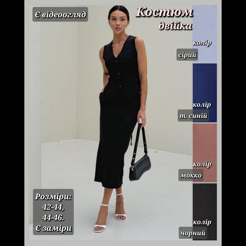 Костюм жилетка и юбка мод.733 тканина: креп костюмка размеры: 42-44, 44-46 цвета: черный, темно синий, серый, мокко Есть замеры Есть видео обзор