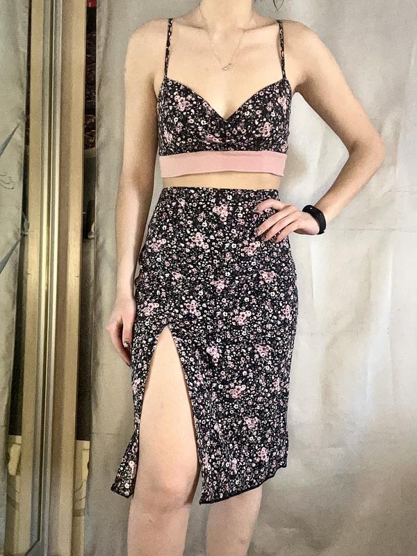 Костюм літній із спідницею і топом корсетним і спідницею міді в квітковий принт ручної роб...