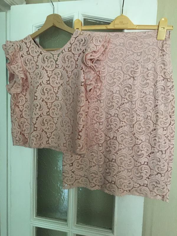 Очень красивый гипюровый костюм Zara, с юбкой -карандаш и топом. Цвет пудрово-розовый. Качественный гипюр. Шикарно смотрится в комплекте, но можно компоновать и с другими изделиями. Практичная длина юбки. При росте 170 юбка была по колено. Юбка: длина - 61 см., ширина в бёдрах - 44 см., ширина в талии - 36 см. Топ: длина - 46 см., ширина в груди - 45 см., ширина в талии - 45 см., плечо от шеи до оборок - 7 см.